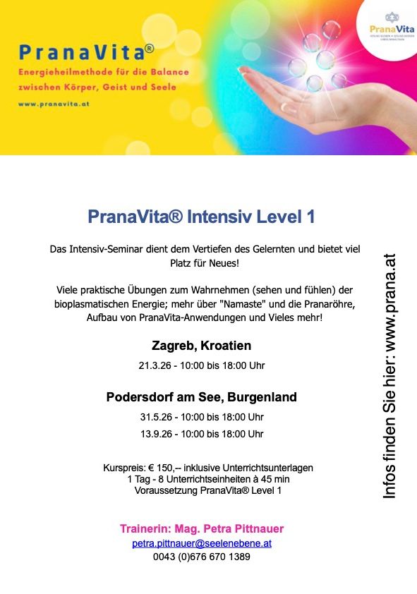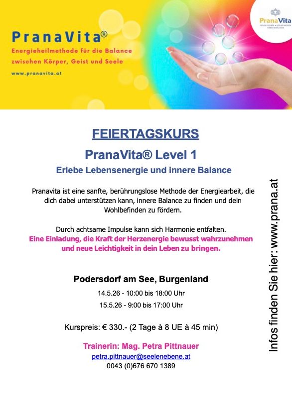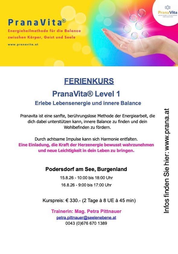 Ab sofort ist die Anmeldung für meine PranaVita® Level 1 Grundkurse (keine Vorkenntnisse notwendig) in Podersdorf möglich:
