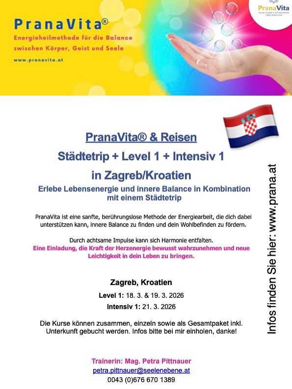 Verbinde PranaVita Level 1 (Grundausbildung) und/oder das Intensiv 1 mit einem Städtetrip nach Zagreb! - Ich begleite Dich als Trainerin durch die Kurse und durch die Hauptstadt Kroatiens!