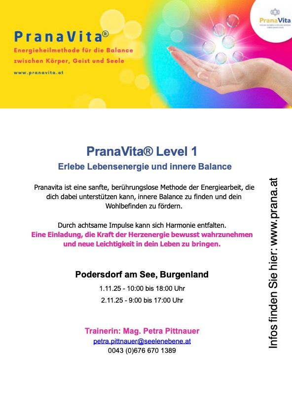Ab sofort ist die Anmeldung für meinen PranaVita® Level 1 Grundkurs (keine Vorkenntnisse notwendig) in Podersdorf am 1. und 2. November 2025 möglich!